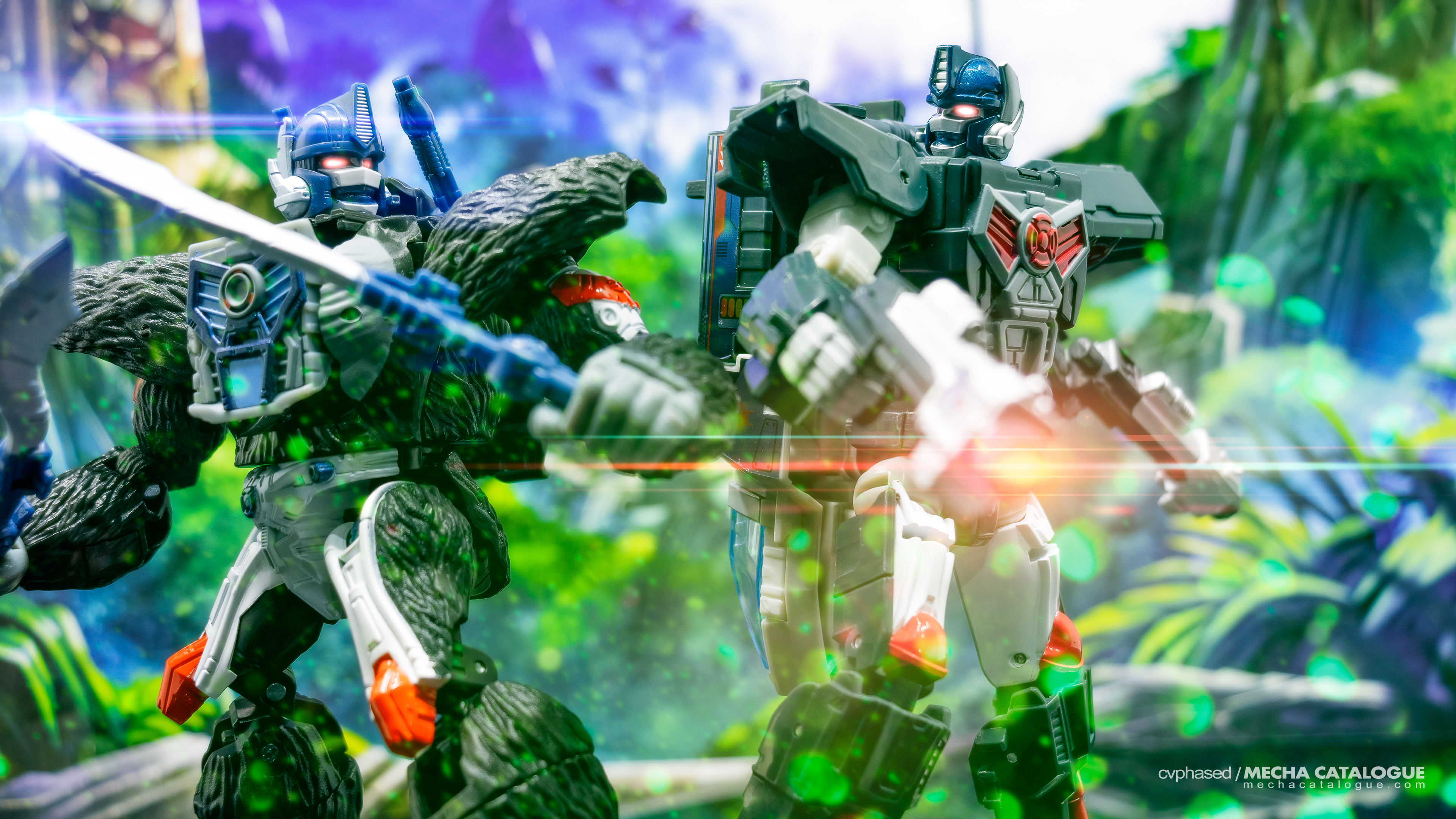 While cruising as a Cybertronnian cargo ship, Optimus Primal spots a bright green light approaching him. He tries to evade but the mysterious light seems to be catching on faster. In a last-ditch effort, he transforms into robot mode and prepares his blasters as the light engulfs him. After a couple of kliks, he finds himself in a lush forest, teeming with the same green energy that brought him there. He then sees a remarkably similar yet different figure. One holding bladed weapons instead of blasters, and they look at each other with great curiosity…