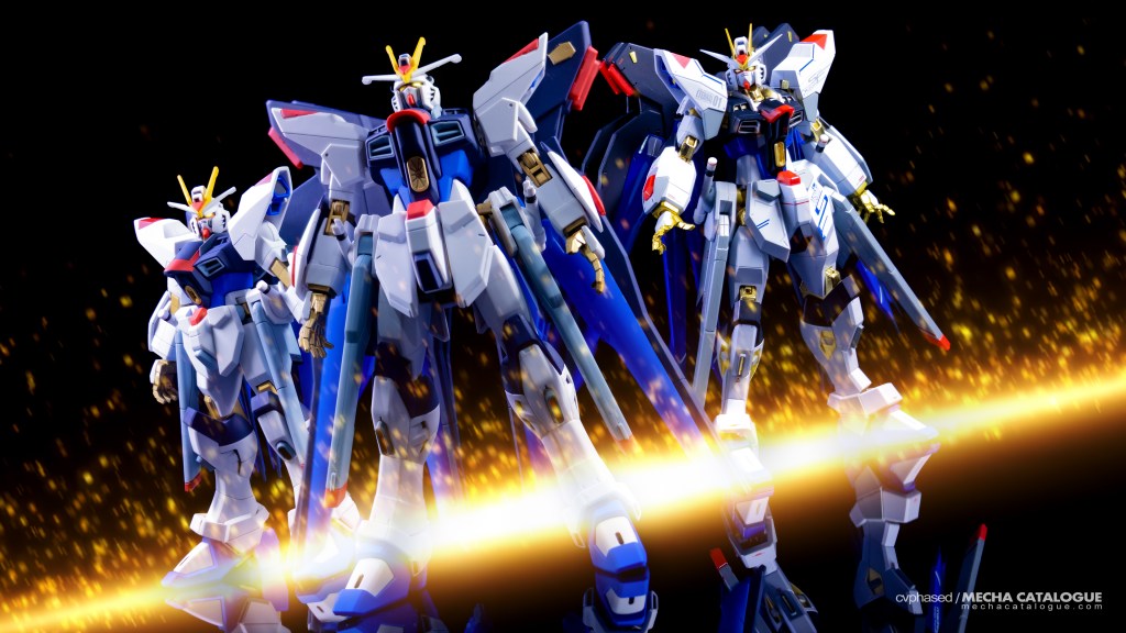 The difference is best captured by three depictions of the Strike Freedom Gundam we have here. You can surmise that the original 2005 HG kit is closer to Kunio Okawara’s line art, while the 2018 Metal Robot Spirits figure swings to the opposite end with its animation-accurate proportions, albeit with my aforementioned caveats. I personally prefer the 2016 HGCE kit as it strikes the right balance between the two aesthetic choices.