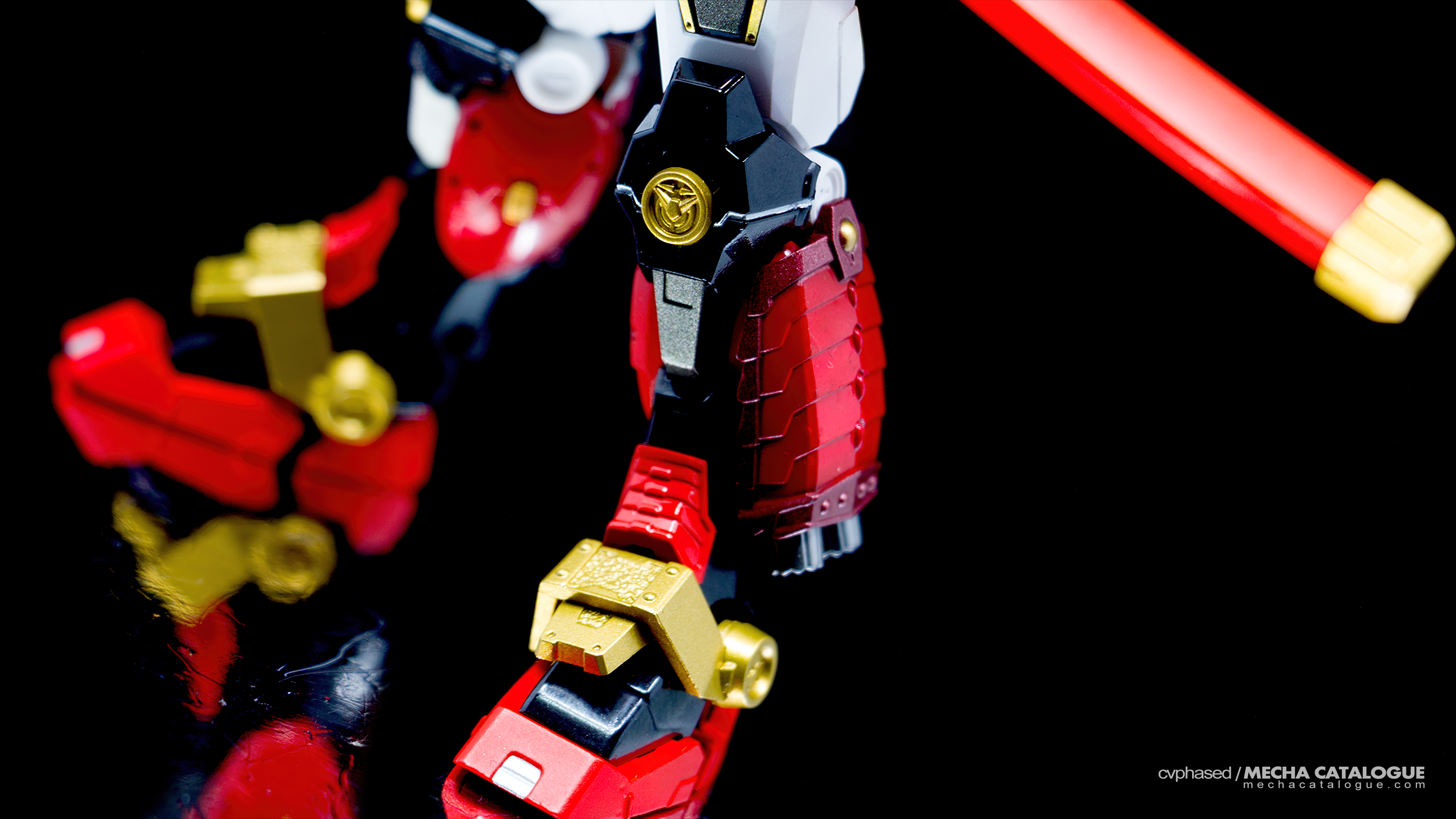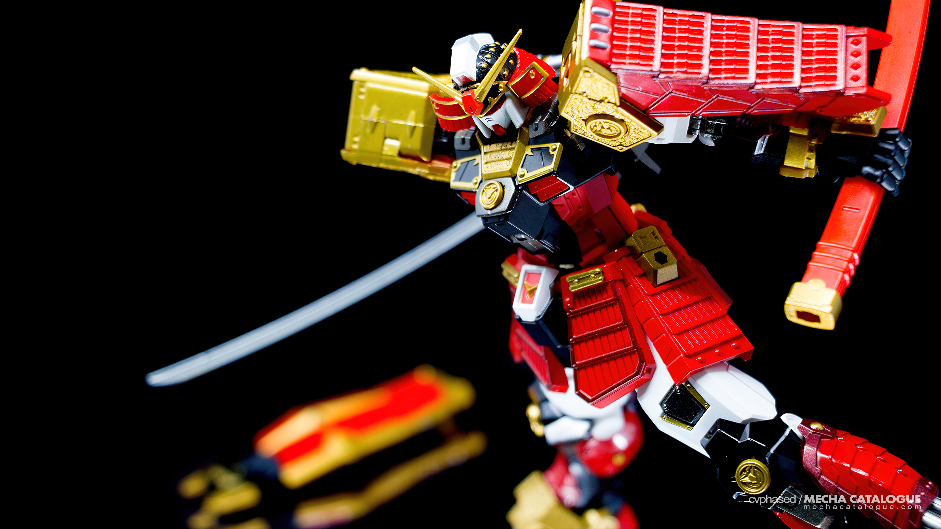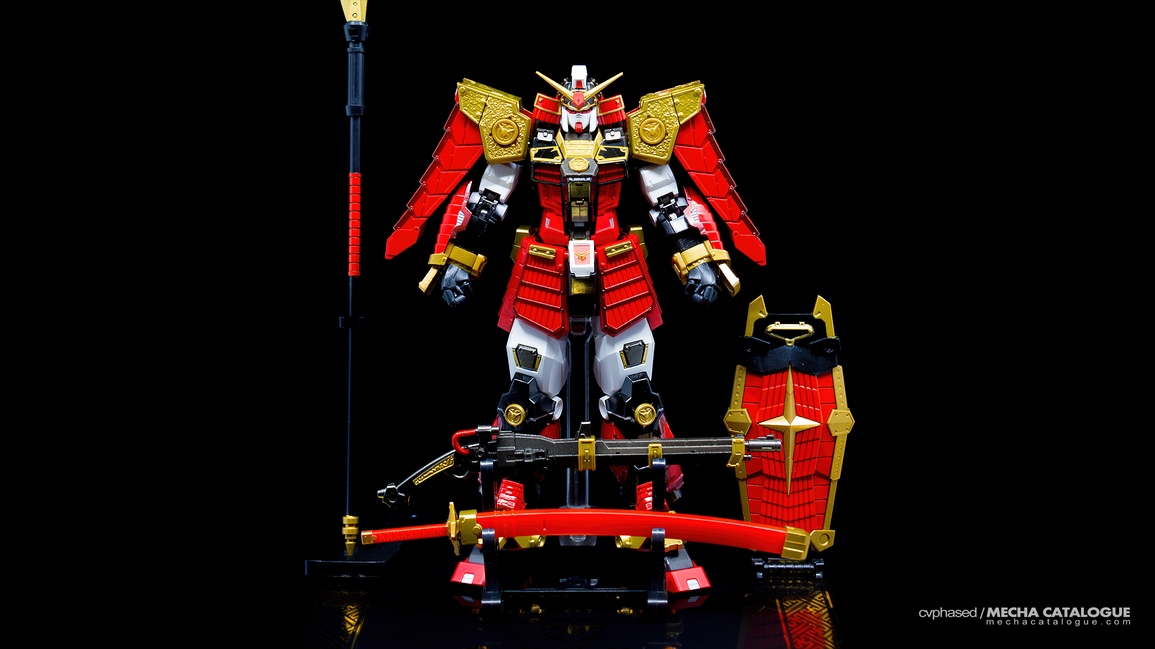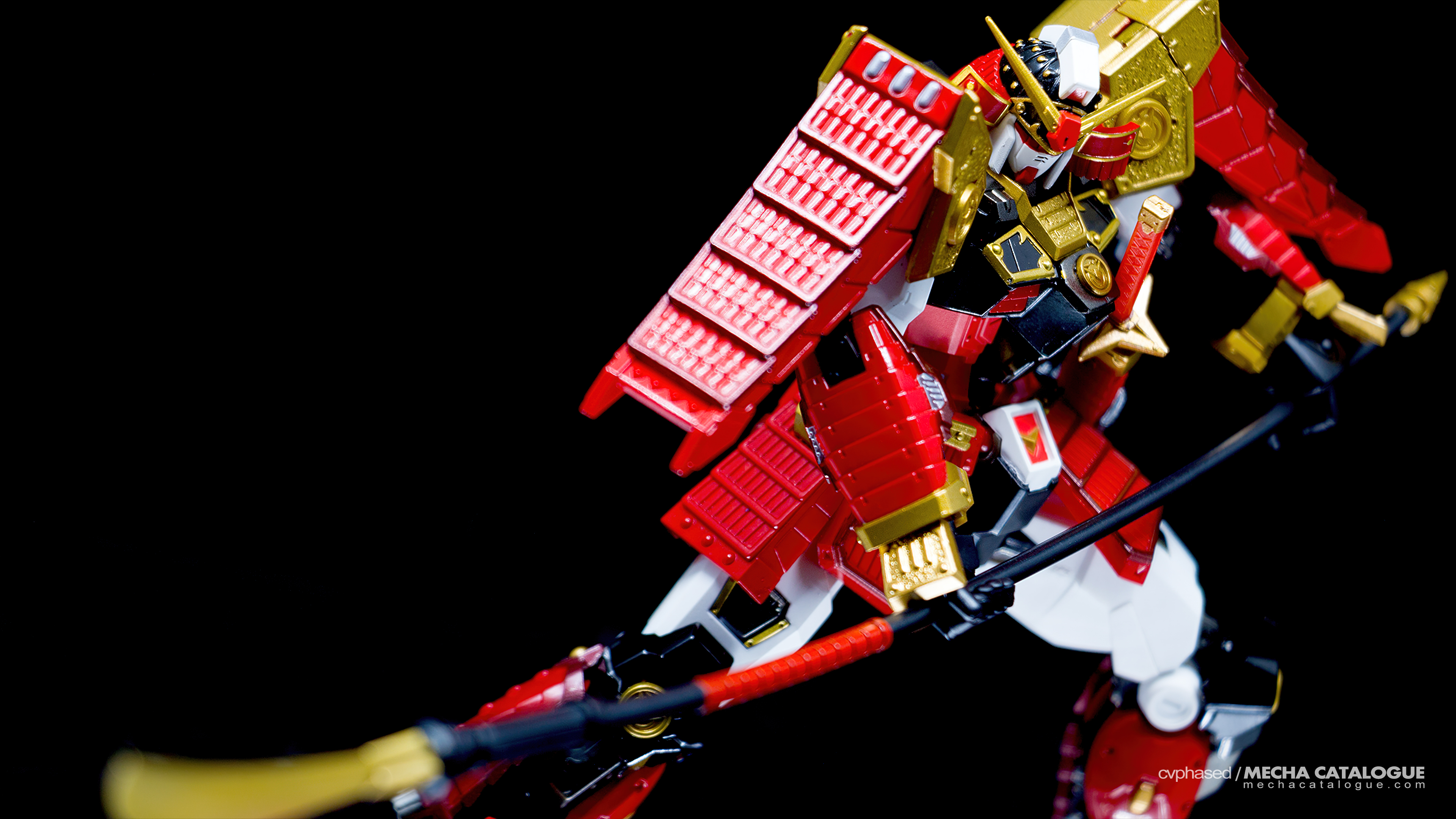 The die cast parts mainly provide stability and are limited to the joint assemblies and lower limbs. This helps in the poseability as the Musha Gundam design is derived from a warrior clad in samurai armor. The armor panels feature tons of sculpted detail to look like linked plates and are painted in bright red and brick red accents on the edges for added depth while the ornamented bits are mostly in gold. Articulation is standard though the large shoulder armors can hinder outward arm movement. The ankle armors on my copy also tend to pop off which can be annoying when doing wide-legged poses. Replacement hands aside, the Musha Gundam has several weapons: a katana, shield, naginata (straight and bent), and Tanegashima Rifle. Display options include a black base with gold lettering, and racks to display all weapons with the actual figure similar to how samurai armors are seen in Japanese museums.