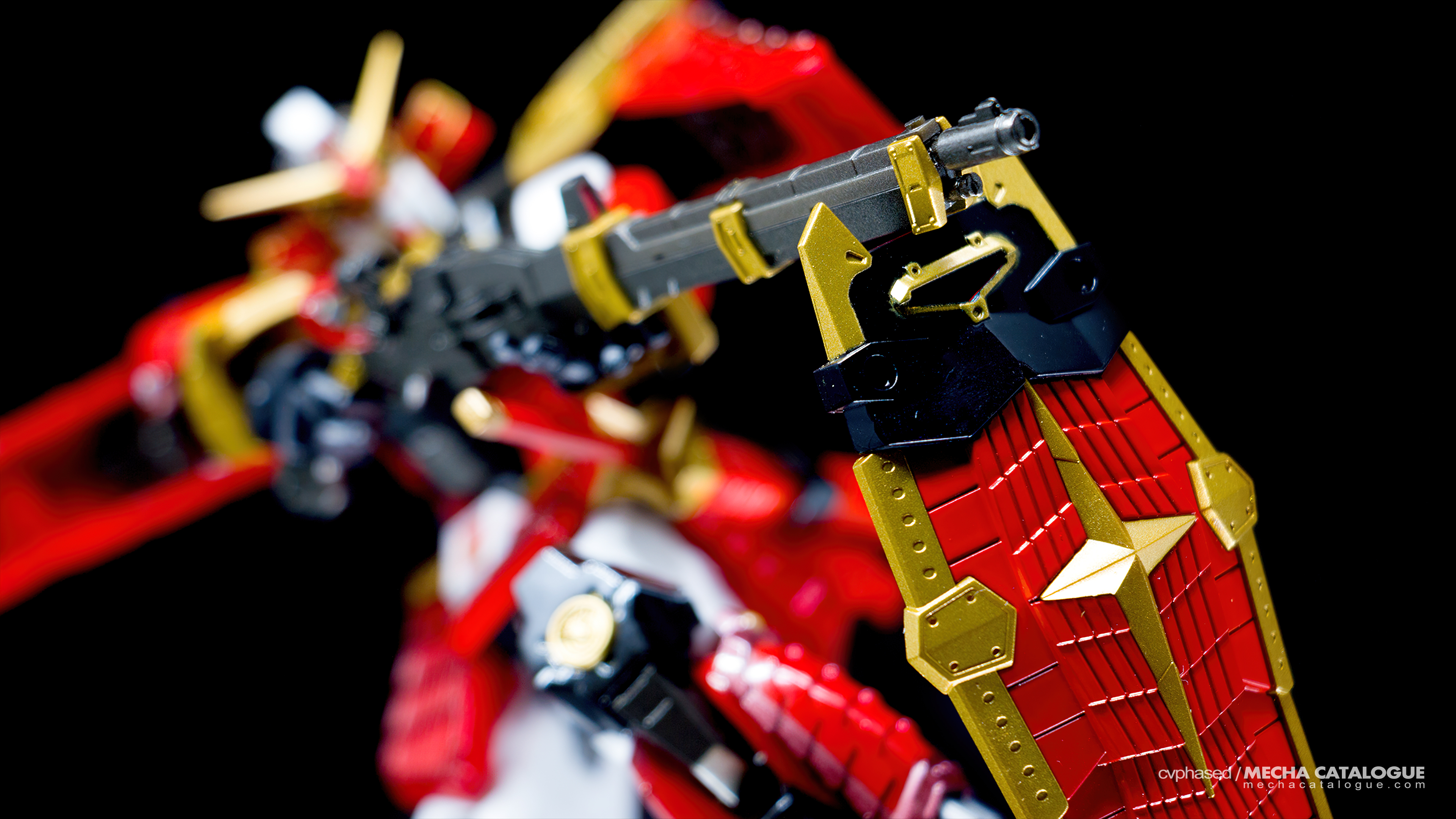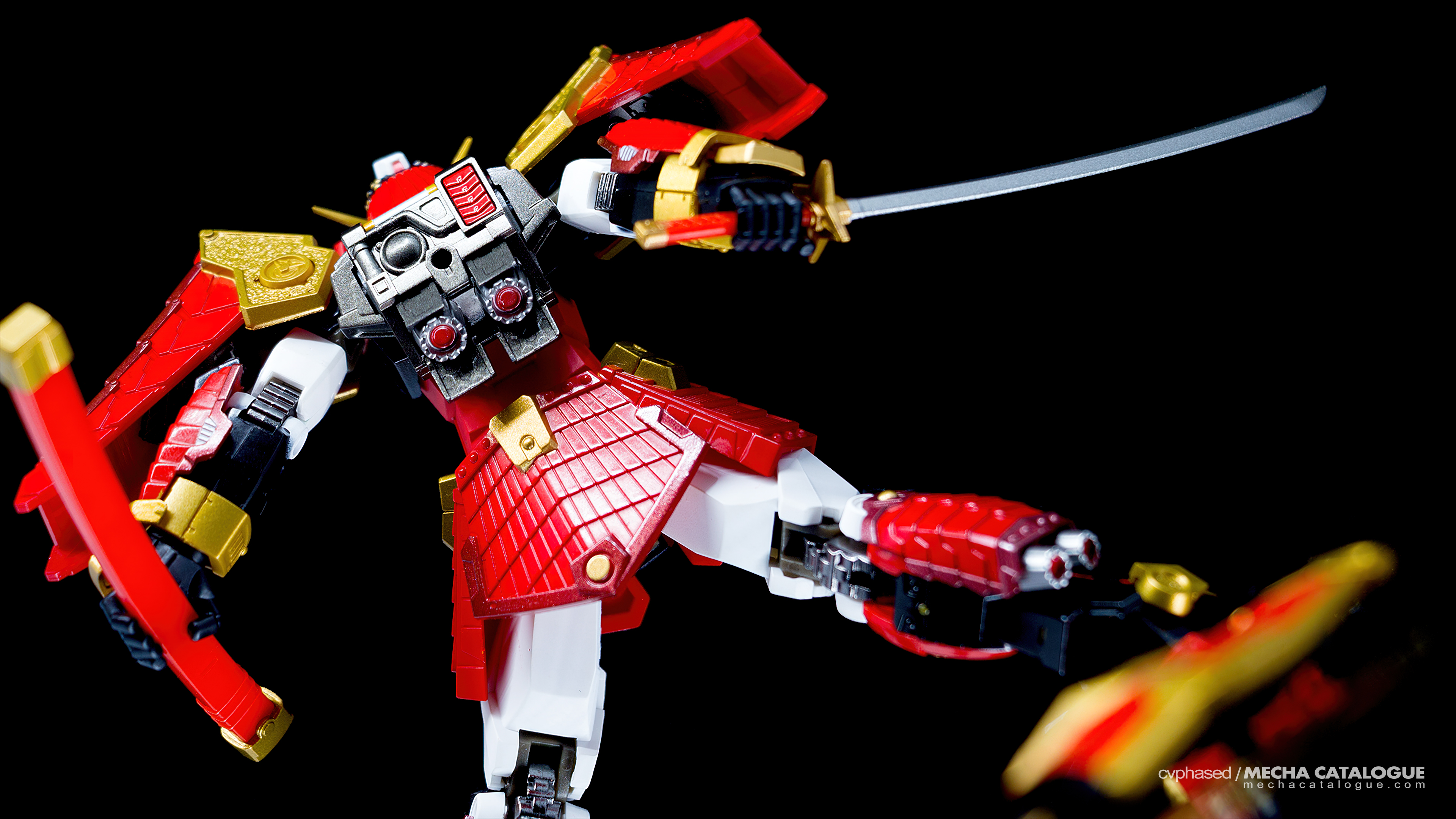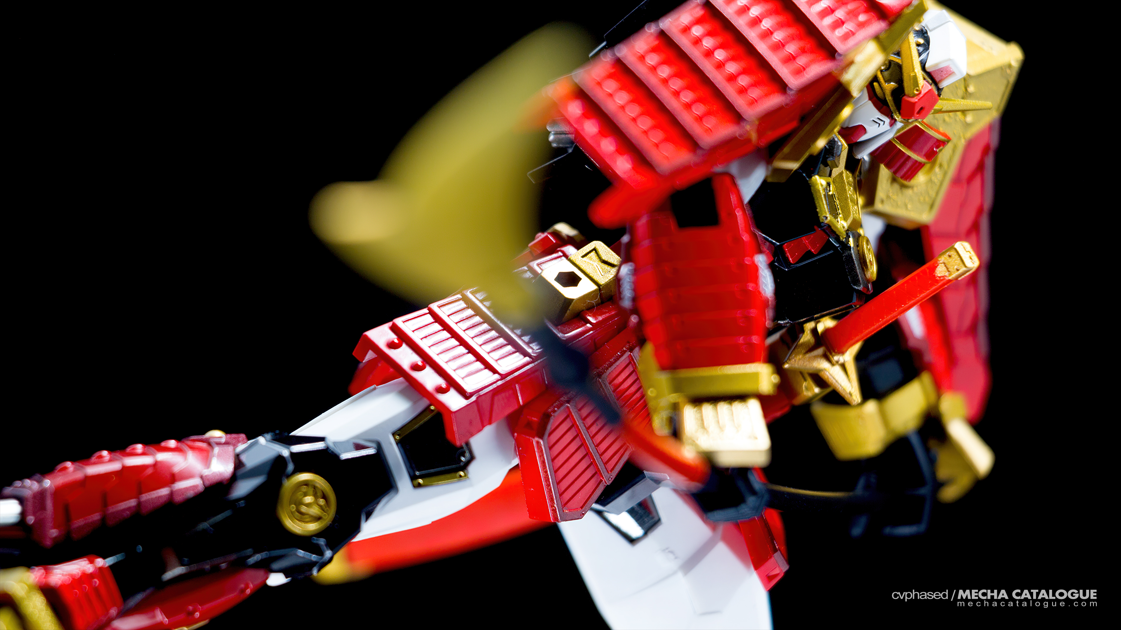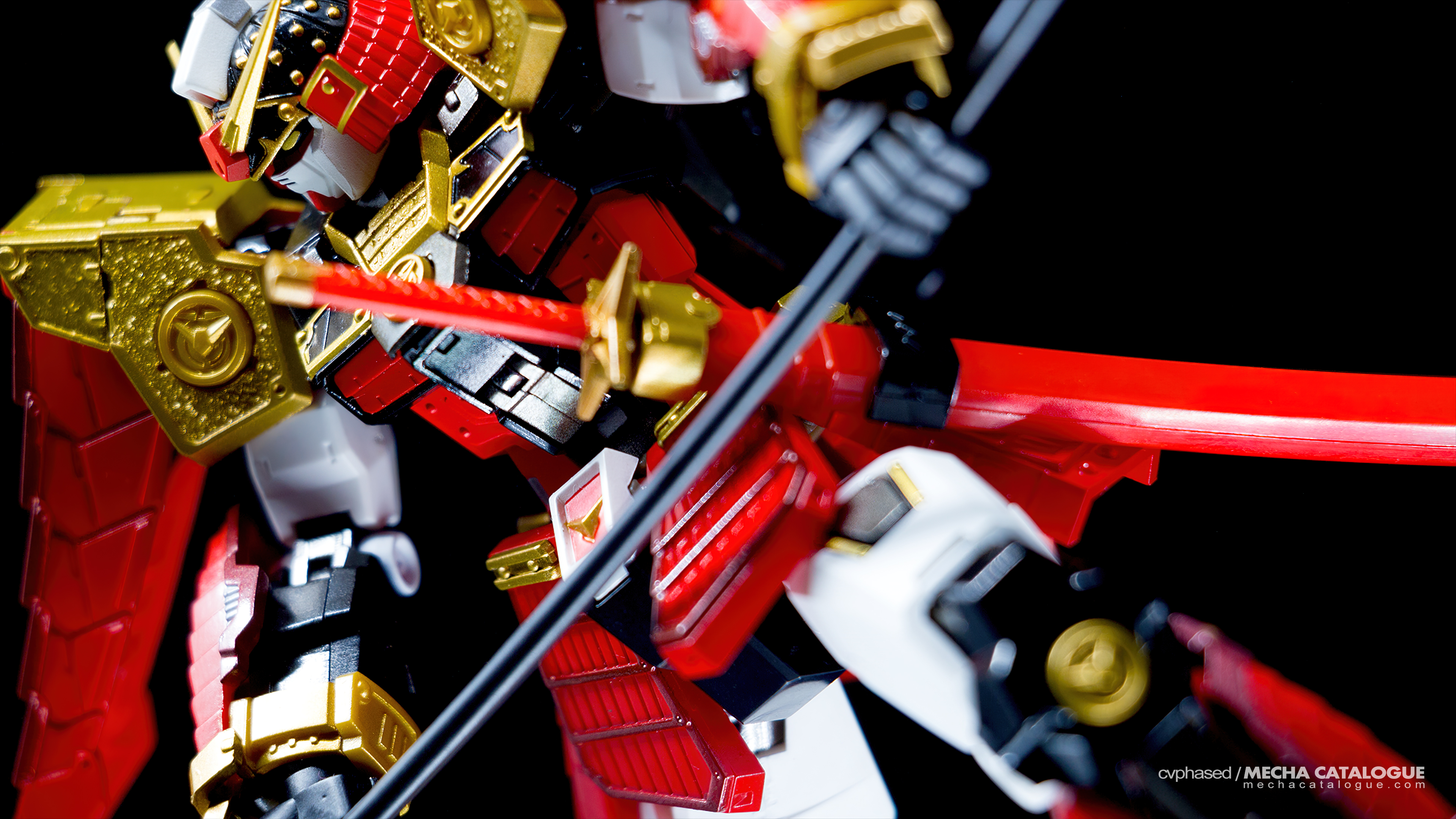 The die cast parts mainly provide stability and are limited to the joint assemblies and lower limbs. This helps in the poseability as the Musha Gundam design is derived from a warrior clad in samurai armor. The armor panels feature tons of sculpted detail to look like linked plates and are painted in bright red and brick red accents on the edges for added depth while the ornamented bits are mostly in gold. Articulation is standard though the large shoulder armors can hinder outward arm movement. The ankle armors on my copy also tend to pop off which can be annoying when doing wide-legged poses. Replacement hands aside, the Musha Gundam has several weapons: a katana, shield, naginata (straight and bent), and Tanegashima Rifle. Display options include a black base with gold lettering, and racks to display all weapons with the actual figure similar to how samurai armors are seen in Japanese museums.