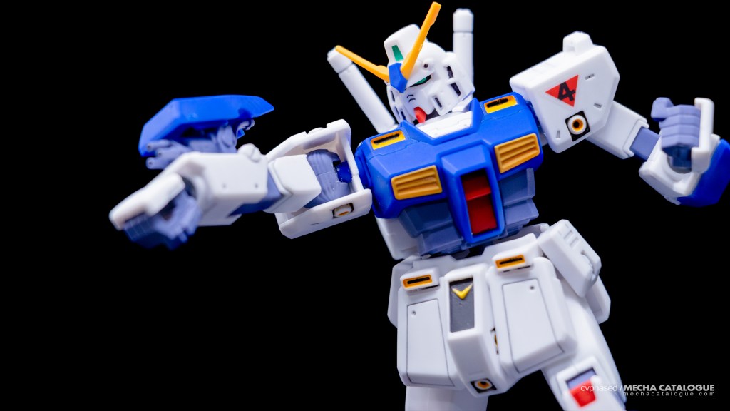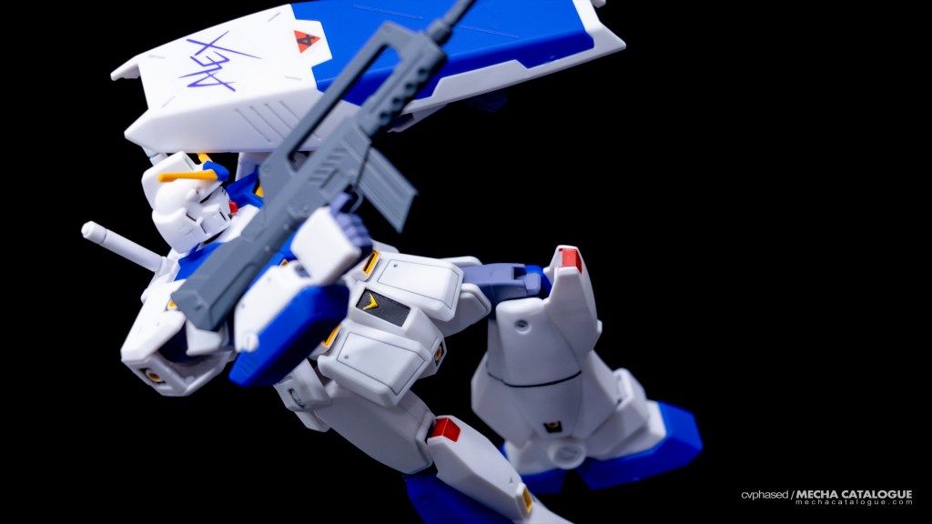 I see two reasons for this. First, the white plastic it uses is so white that it easily drowns all the sculpted surface details. This is very evident in the white backpack, which in itself is uncommon among Gundam designs. I also found the sculpted details on mine to be a little soft, even when compared to older kits at the time of release. The second reason is how all the verniers and vents don’t come in yellow plastic. Outside of the white and blue parts, the abundance of these verniers and vents breaks the otherwise monotonous design, and unless you put the extra effort and paint them, the kit won’t look good. As mentioned, the kit has standard High Grade articulation and for more display options, it comes with several weapons. These include a beam rifle, shield, beam sabers (with a single beam effect part), and additional replacement gatling gun parts for the forearms. If you want the kit to look better without putting much effort, then you’re in luck as it includes parts for the Chobham Armor. These are meant to be attached and detached easily and you can use them to cover the otherwise plain kit underneath.