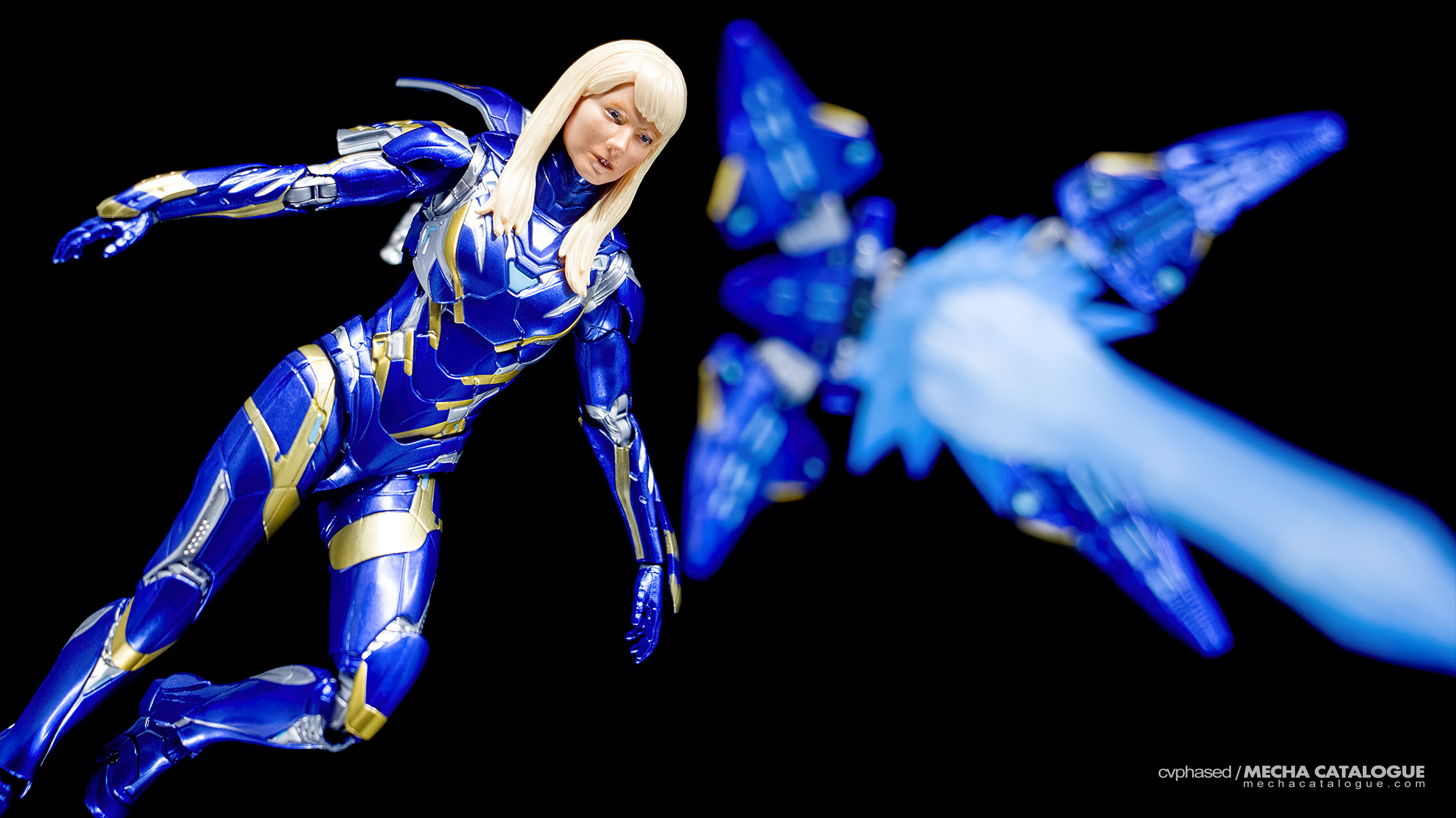 Overall figure details are quite accurate to its on-screen counterpart. Sculpt is sharp and paint application is vibrant, though my copy did have some blotches on the left thigh armor so mileage may still vary. Articulation is as expected but with some asterisks. While this is an Iron Man armor, Rescue doesn’t really fire her palm Repulsors. Each forearm has an armor piece that extends to the back of the hands that hinders Repulsor blast firing poses, not to mention the lack of Repulsor effect parts. This is compensated for by the main feature of this figure, the Autonomous Energy Displacers (or drones) and can be displayed in two configurations. They can be attached to the back through the replacement panel with open flaps or as autonomous units via any display stand with a 3 mm peg. Lastly, there’s the Pepper Potts replacement head. Recent S.H.Figuarts head sculpts have been a hit-or-miss deal, and the same is true with Pepper Potts. It’s a little off but still has an overall resemblance. Her hair is also solid plastic which limits head articulation to slight side-to-side swivels.