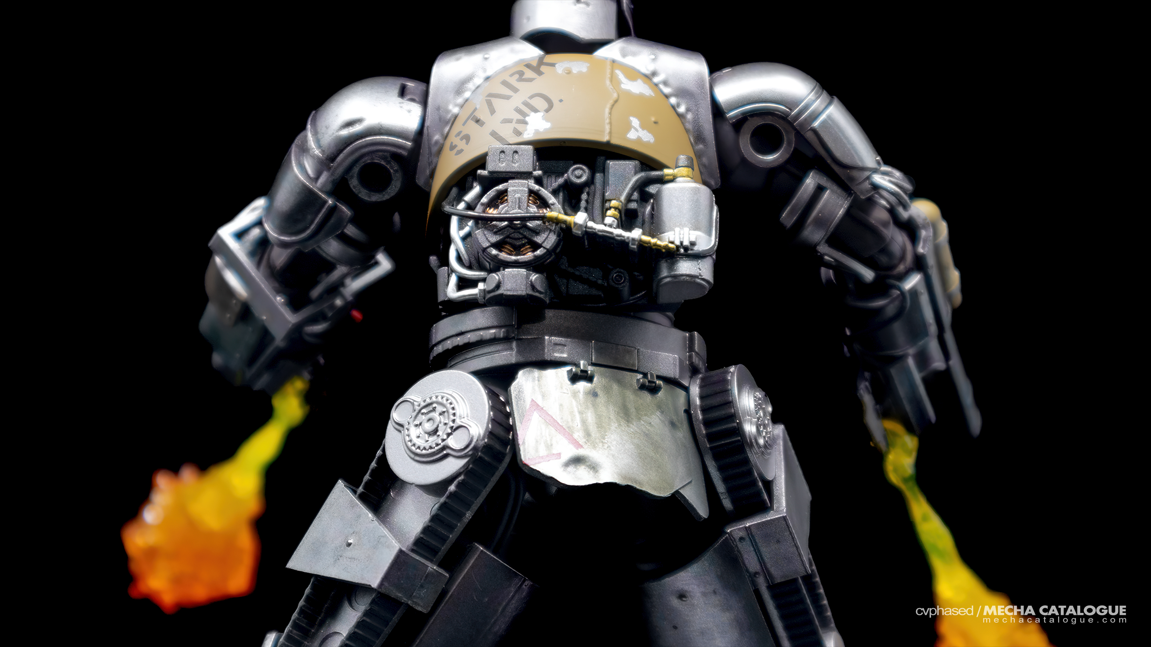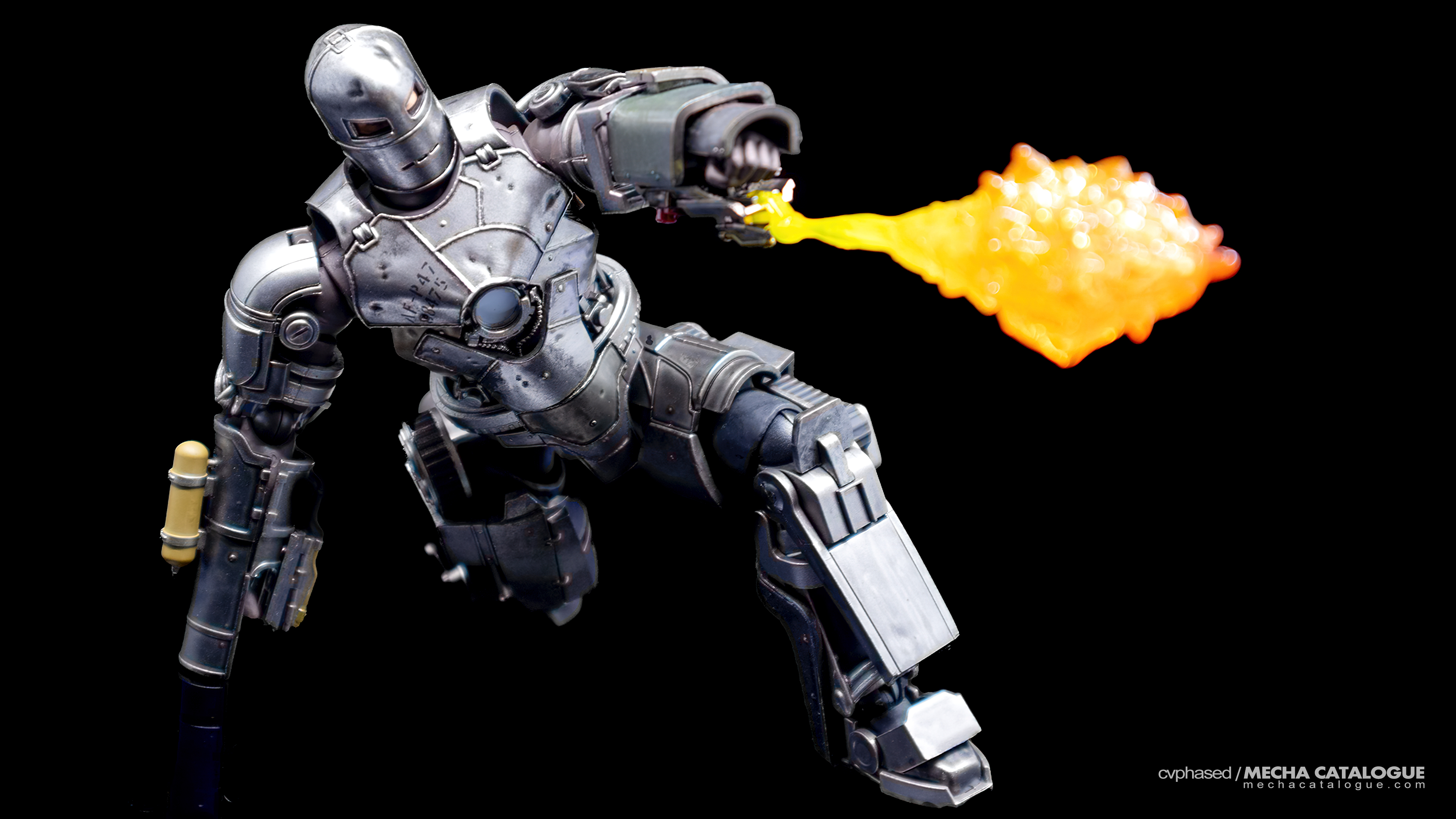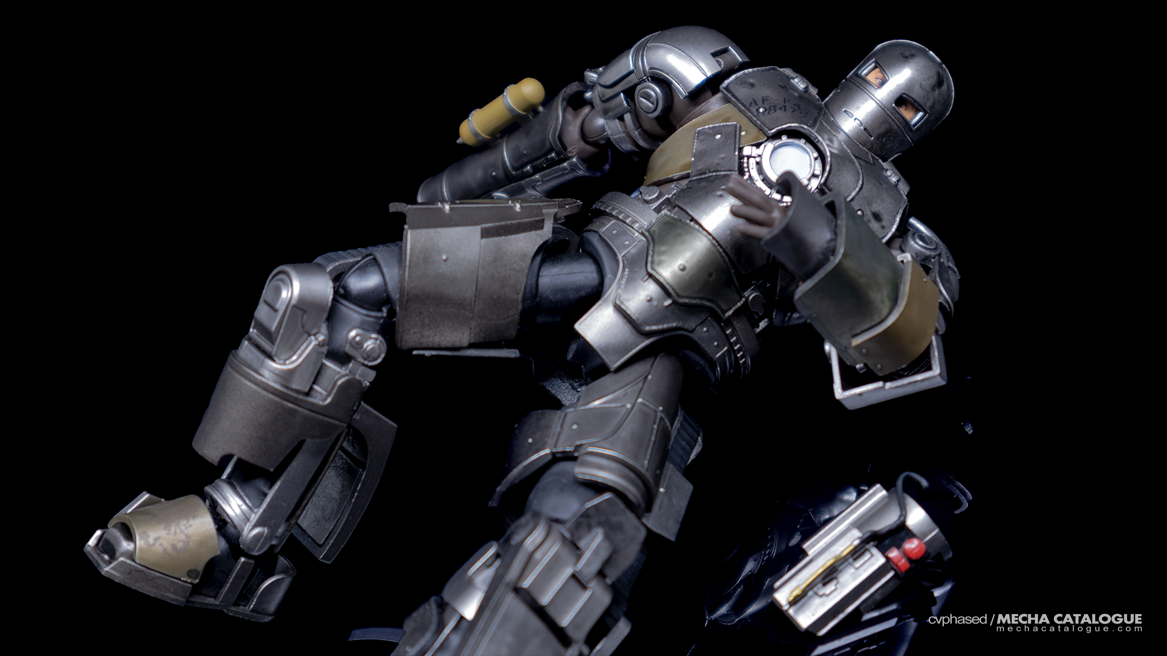 Iron Man Mark 1, as Obadiah Stane angrily puts it, was made in a cave with a box of scraps. And this figure does feel made with a box of scraps, not in build quality but in sculpted and surface details. A signature characteristic of the Mark 1 is all the exposed components and machinery that keeps it running. As expected from an S.H.Figuarts release, this figure doesn’t skimp on details, especially on the improvised power source seen at the back, and the large power transfer belt assemblies going from the hips to the knees. The use of multiple textures and printed markings on various surfaces also adds to the effect of being made from mixed parts despite the smaller scale. What they did skimp on is the Arc Reactor, where it’s usually a clear piece on top of a detailed part of previous figures. For this guy, it’s just a light blue plainly painted area, something you’d see more on a Marvel Legends figure. Articulation is on par with its on-screen counterpart, meaning it’s got basic movements but don’t expect it to do dynamic poses. To compensate, the figure comes with a good set of accessories: including another pair of hands, and a replacement Tony Stark eye part which requires removing the front face plate to use, and several flamethrower and thruster effect parts to recreate the Afghanistan escape scene.