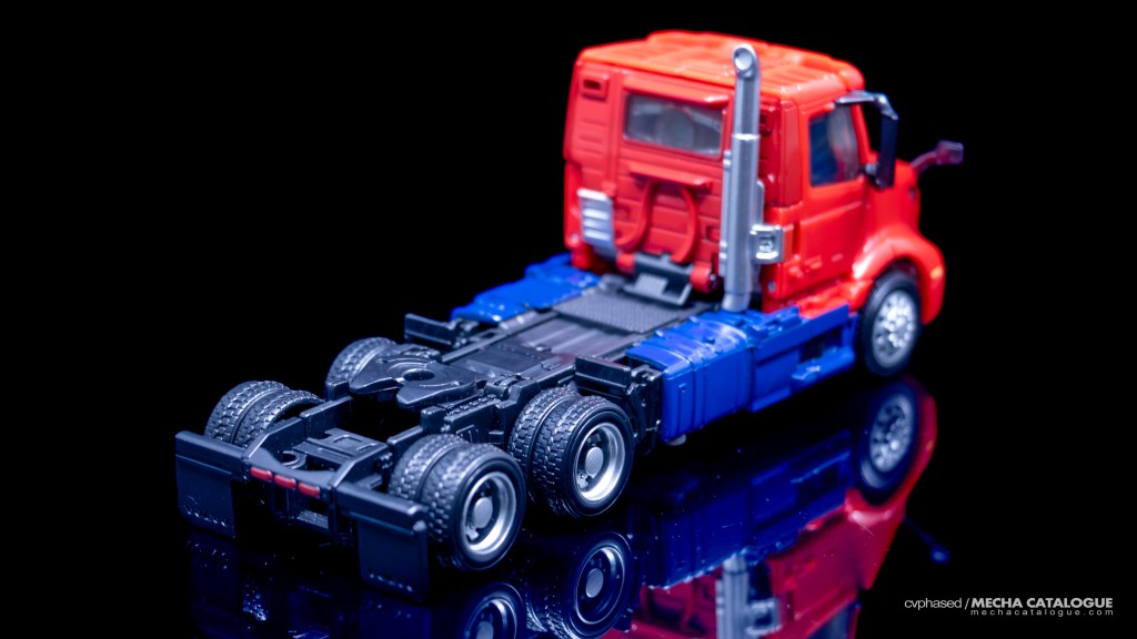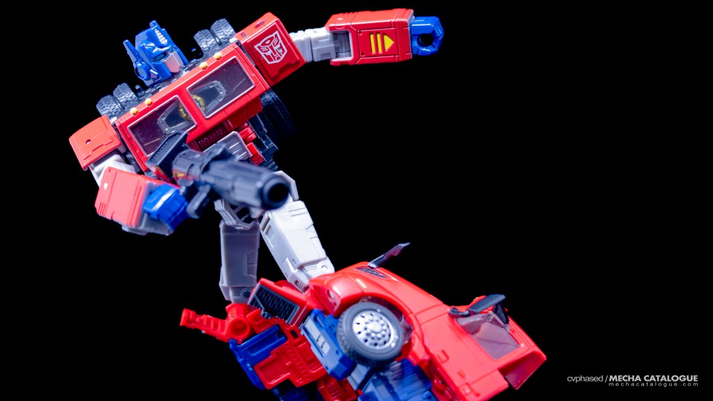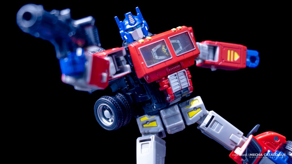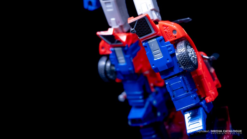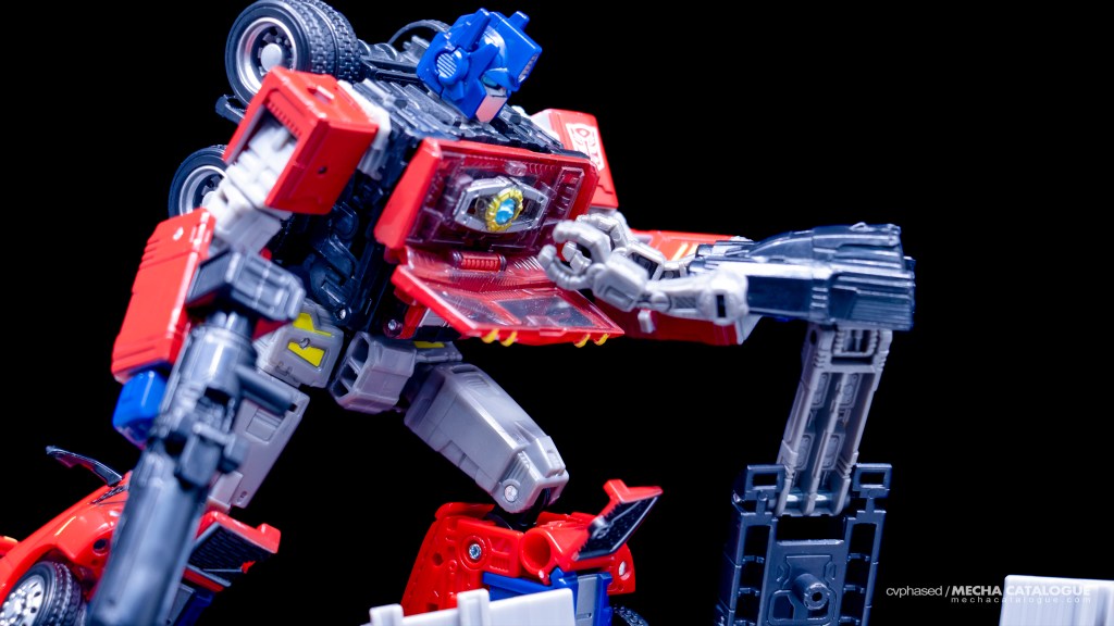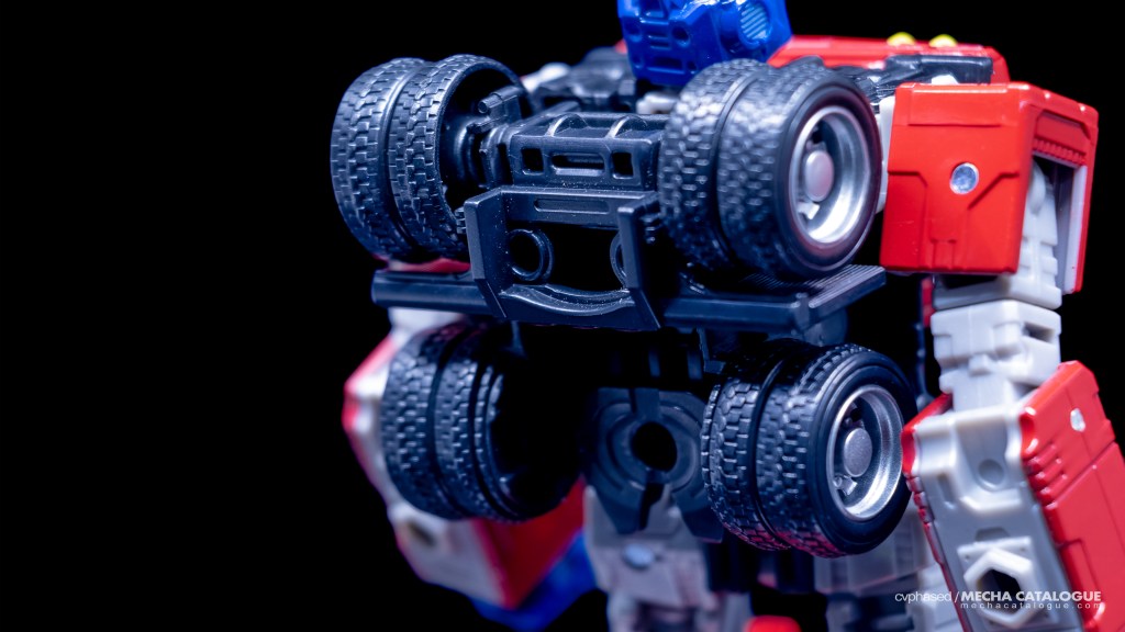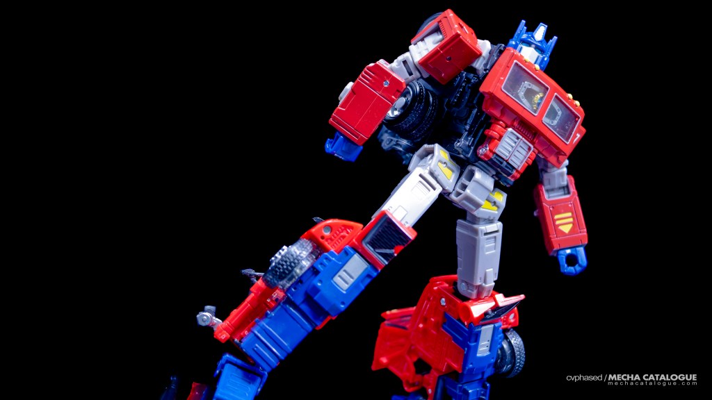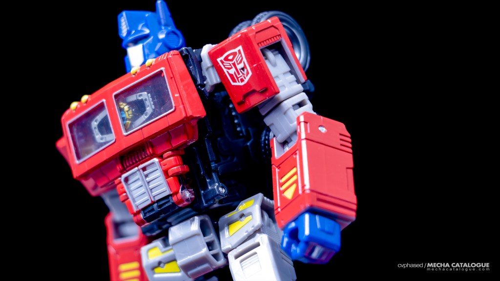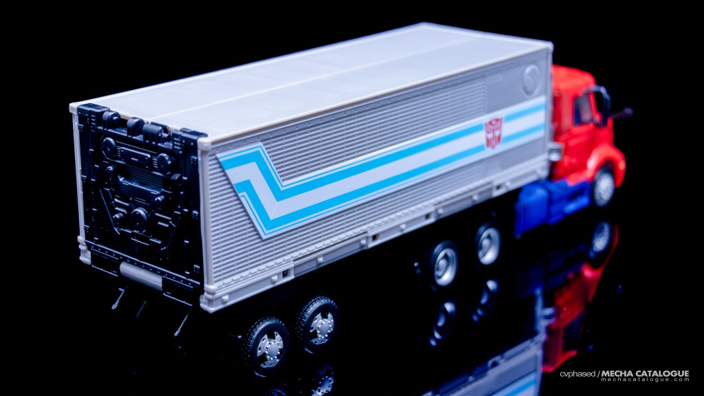 When you look at VNR Optimus Prime in robot mode, you will immediately notice how it takes an entirely different transformation approach when compared to the myriad of Optimus Prime figures released recently. Instead of the front of the VNR truck transforming the torso unit in robot mode, it’s the trailer hitch section that becomes the torso. The front of the vehicle then becomes the legs, and I’m not sure if part of the licensing agreement is to preserve much of the VNR truck in robot mode, but this results in a unique silhouette that I really like. Not only that, but they also even found a way to integrate the Matrix of Leadership, and its chamber, in the chest despite the reversed transformation scheme. The rest of the vehicle compacts into a clean backpack unit, with the actual trailer hitch becoming a port for storing the Ion Blaster. And since you can’t have a VNR haul truck without something to haul, the set comes with the same trailer as Earthrise Optimus Prime, but now with an animation-accurate stripe. Oddly enough, the back of the trailer, and the part that becomes a shield, is molded in black plastic. Articulation is what you’d expect for a modern Transformers release, outside of slightly limited knee movement caused by the larger lower legs.