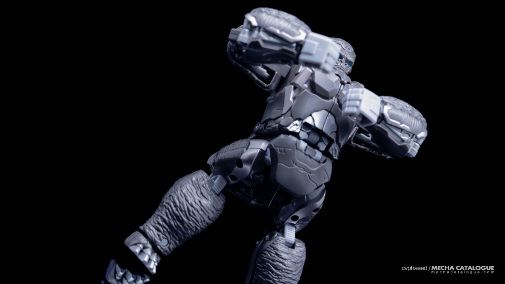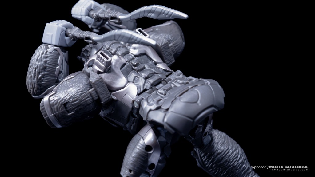 Optimus Primal’s design in Rise of the Beasts is a monotonous combination of dark gray organic and silver technological components, and I’m surprised they went with this design for a character that’s meant to sell toys. But it does work, and this figure of Optimus Prime is a good representation of that design. It’s definitely not as complex as something you’d expect from a Studio Series release but for what it’s accomplishing given its price point, it works. The paint application is all right, but their placement allows for good contrast that such a design needs. It also doesn’t have dynamic articulation, especially for a melee character, but it has the essentials for great poses. And while the transformation isn’t that involved because of the humanoid-to-humanoid conversion, it’s accomplished in a way that provides an excellent play pattern that anyone (me included) can fidget with this figure on a random afternoon. Optimus Primal comes with two scimitars that can store on its back similar to the original and can be held with a single hand to give the illusion of a combined weapon.