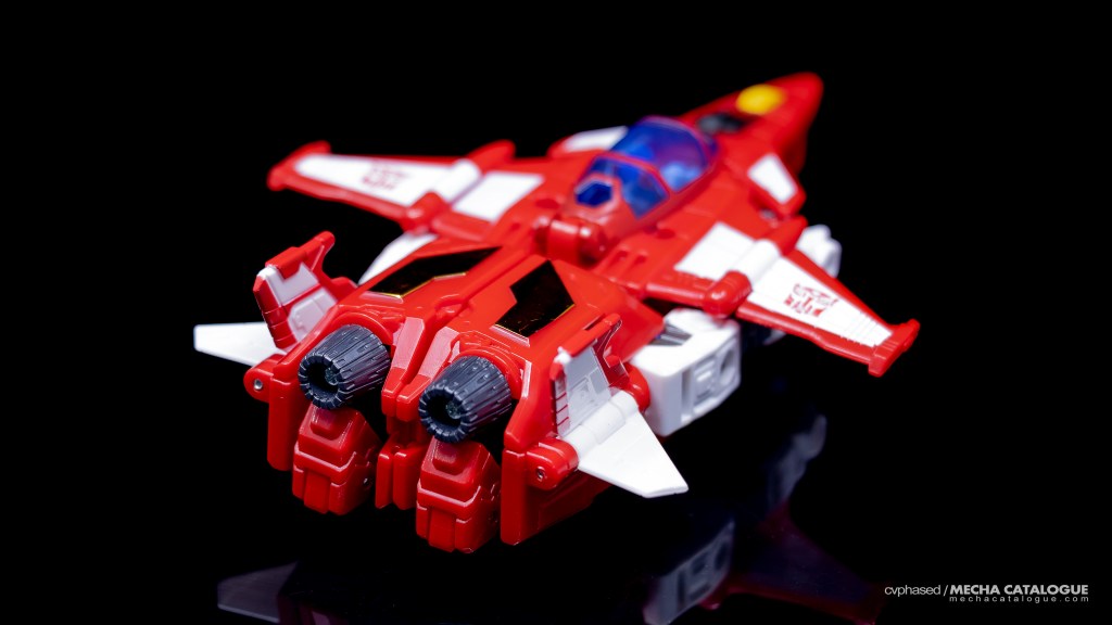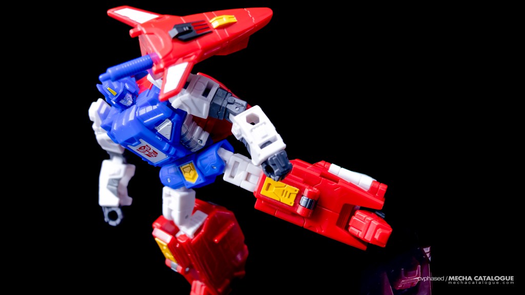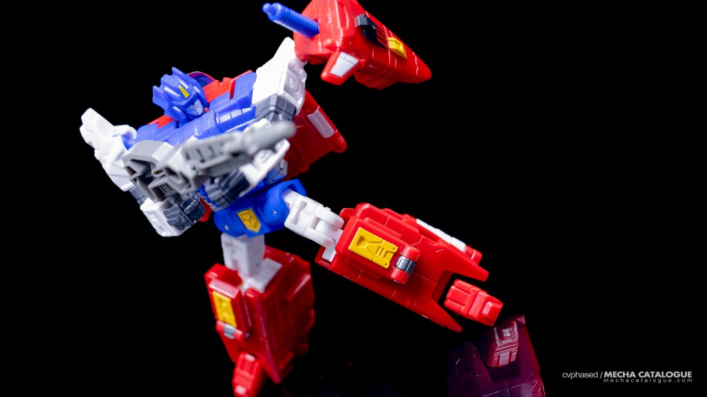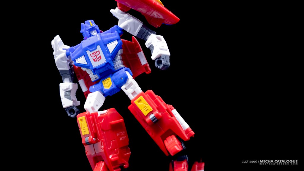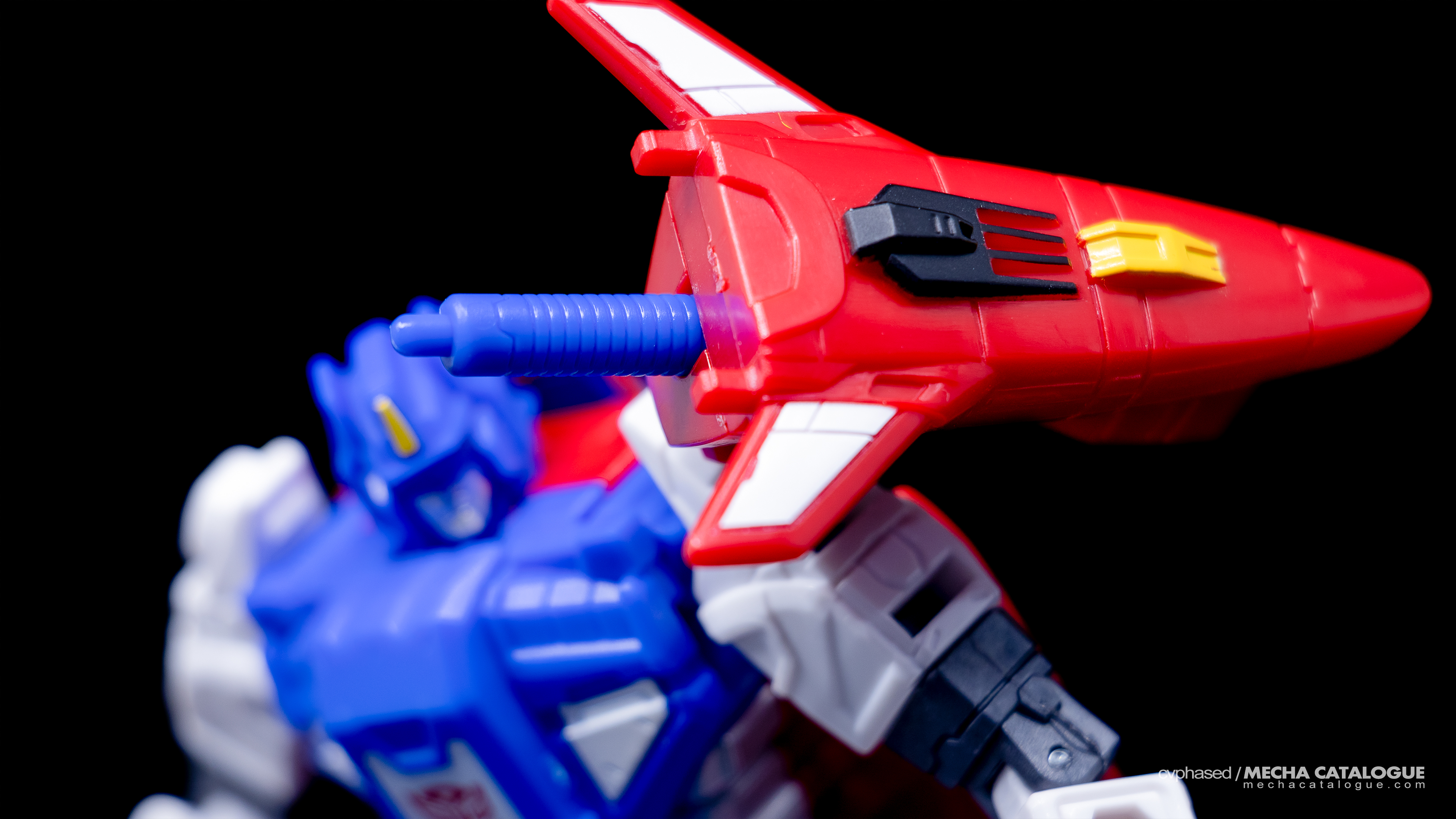 Saber is roughly the size of a modern Deluxe Class figure, but without its limitations. That’s not saying the figure is perfect but Saber does have accurate paint application and great articulation. It also modernizes all the features the original figure had, including the Brainmaster gimmick which now doesn’t hinder head articulation though it’s limited to side-to-side rotation. But otherwise, you’re able to put Saber in a wide array of poses. Saber can also use a couple of accessories, including its rifle called the Saber Laser, and the nosecone of its vehicle mode which can connect on its left shoulder just like the original figure. As mentioned, Saber retains the Brainmaster feature with “Brain of Courage” who is smaller than Titan Masters or Prime Masters from previous lines. It can fit in the chest of Saber, again like the original, but the feature works differently to allow head articulation for Saber. “Brain of Courage” can also fit in the cockpit of Saber in vehicle mode called the Victory Jet.