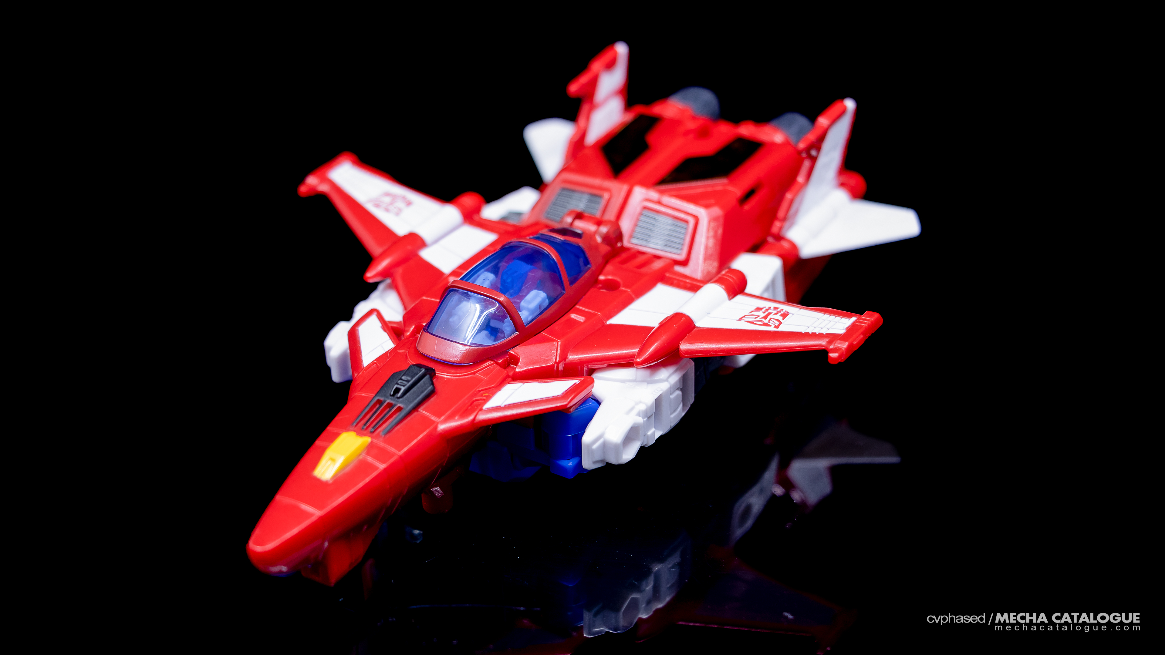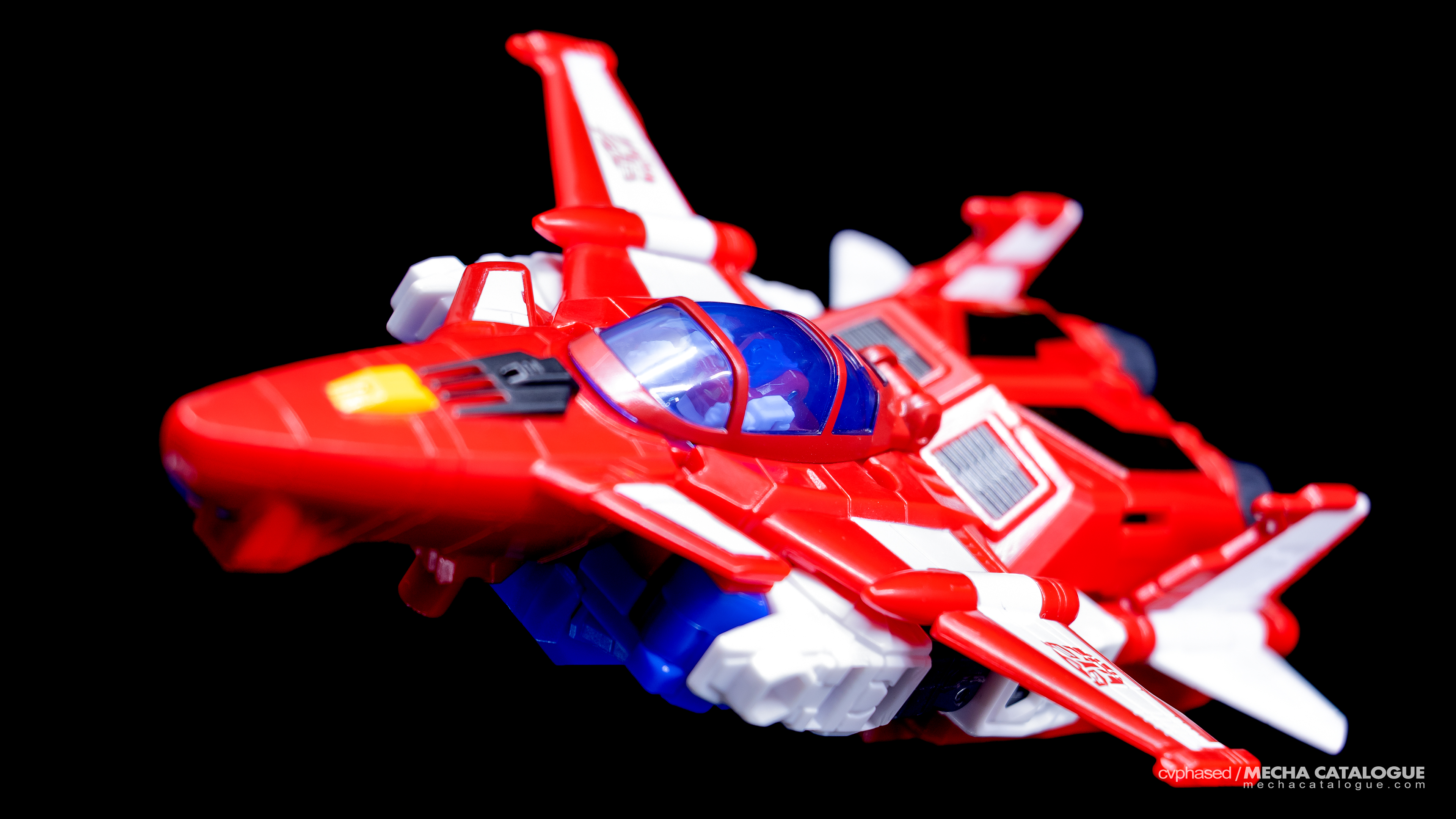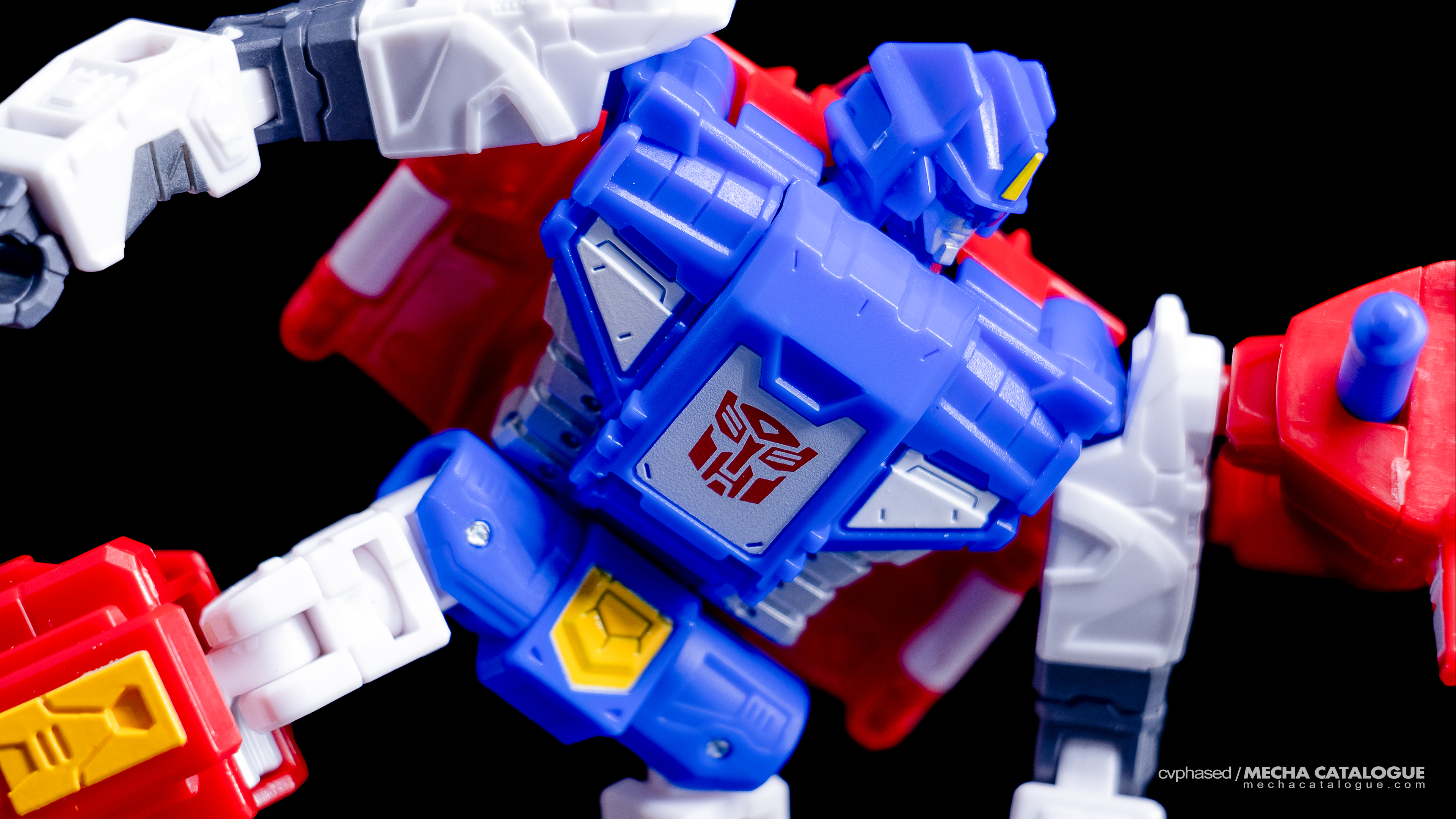 Saber is roughly the size of a modern Deluxe Class figure, but without its limitations. That’s not saying the figure is perfect but Saber does have accurate paint application and great articulation. It also modernizes all the features the original figure had, including the Brainmaster gimmick which now doesn’t hinder head articulation though it’s limited to side-to-side rotation. But otherwise, you’re able to put Saber in a wide array of poses. Saber can also use a couple of accessories, including its rifle called the Saber Laser, and the nosecone of its vehicle mode which can connect on its left shoulder just like the original figure. As mentioned, Saber retains the Brainmaster feature with “Brain of Courage” who is smaller than Titan Masters or Prime Masters from previous lines. It can fit in the chest of Saber, again like the original, but the feature works differently to allow head articulation for Saber. “Brain of Courage” can also fit in the cockpit of Saber in vehicle mode called the Victory Jet.